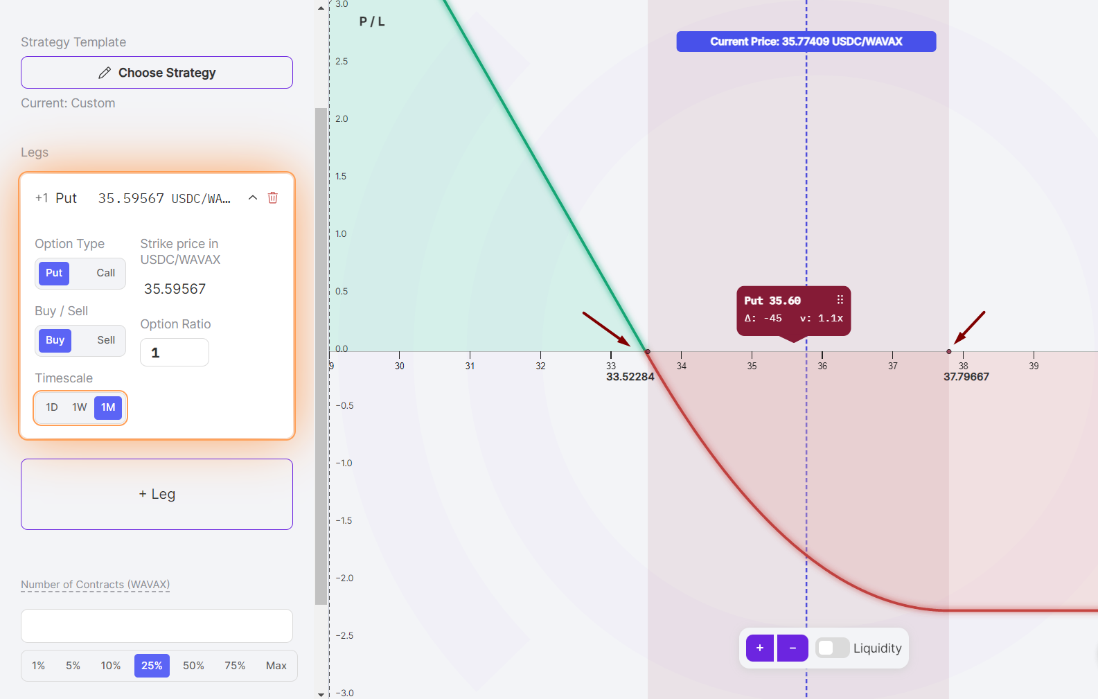 The width is defined by the position's lower and upper price range. For example, one contract of a one-month (1M) AVAX put option with a lower price of $33.52 and upper price of $37.80 has a width of $4.28 ($4.28 = $37.80 - $33.52).