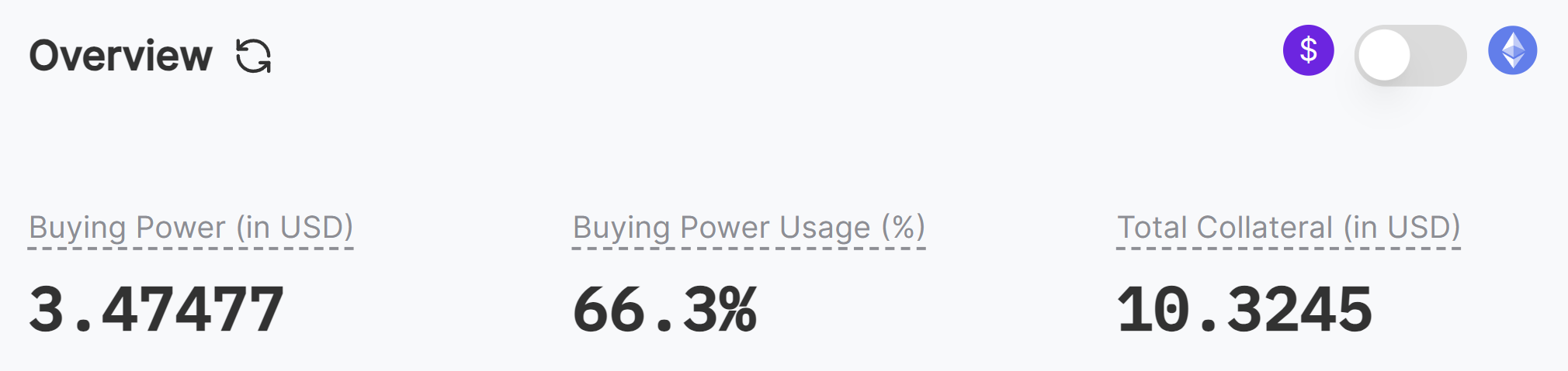 - Buying Power (in USD): The total capital available for trading. Opening new positions will reduce your buying power by the position requirement.