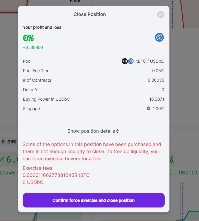 Example: Alice sells an ETH call option. Bob buys Alice’s call. If there is not enough liquidity from other sellers and Alice wishes to close her position, she must force Bob to exercise his position before closing her own. Hence, Alice force exercises Bob’s long position and then closes her own short position.