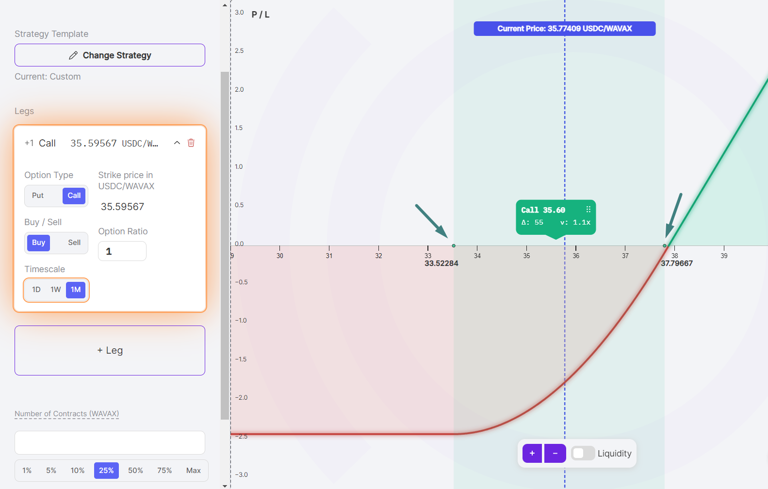 Each option contract is uniquely defined by the three components above. For example, a 2000 1D ETH put differs from a 2100 1W ETH call. The proportion of available options liquidity in Panoptic determines the spread multiplier on the base amount of streamia buyers must pay to purchase the option.