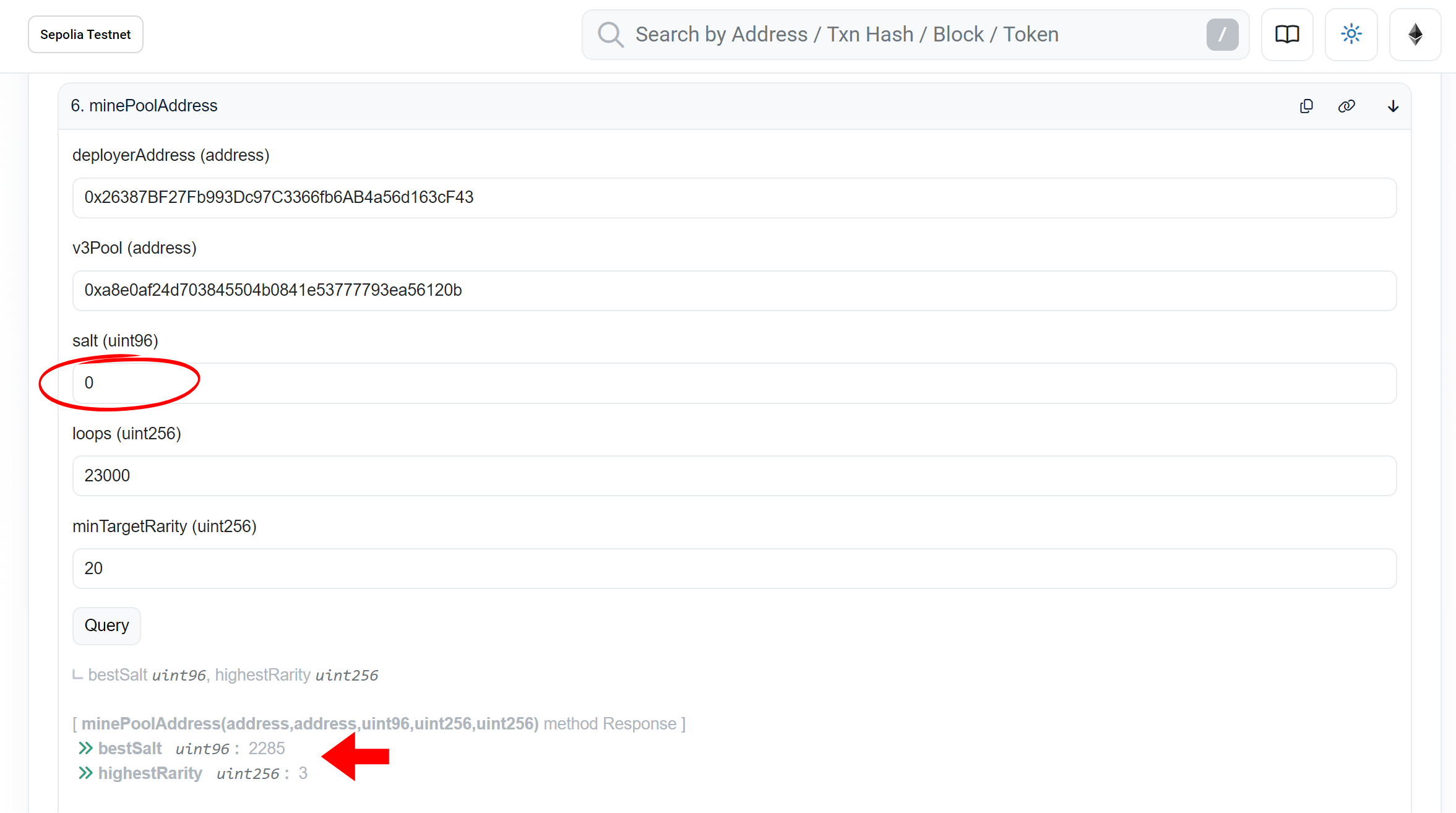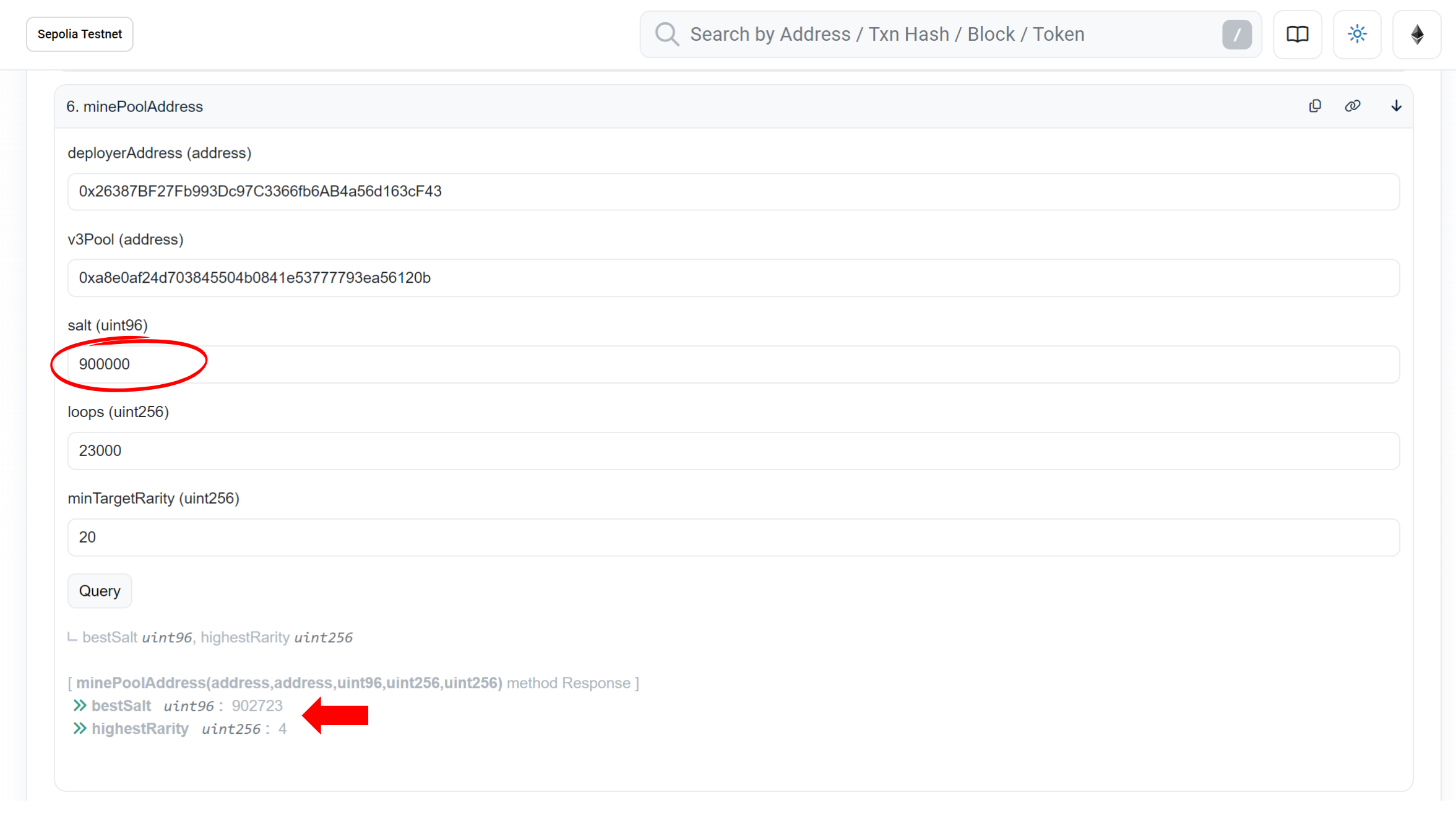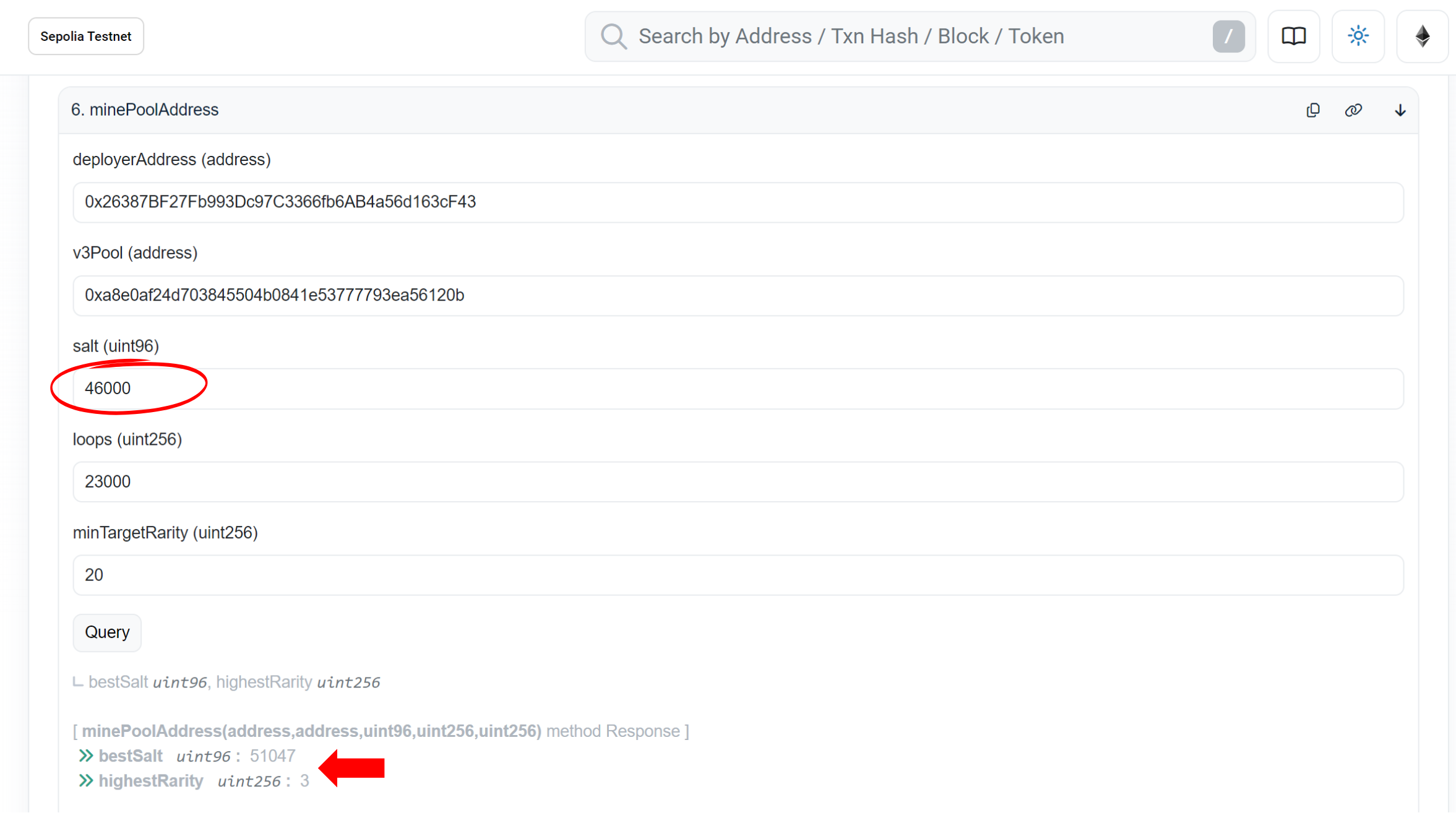 bestSalt: The optimal salt value for creating your pool.highestRarity: The rarity level of the NFT you will receive (based on the number of leading zeros in the mined pool address).