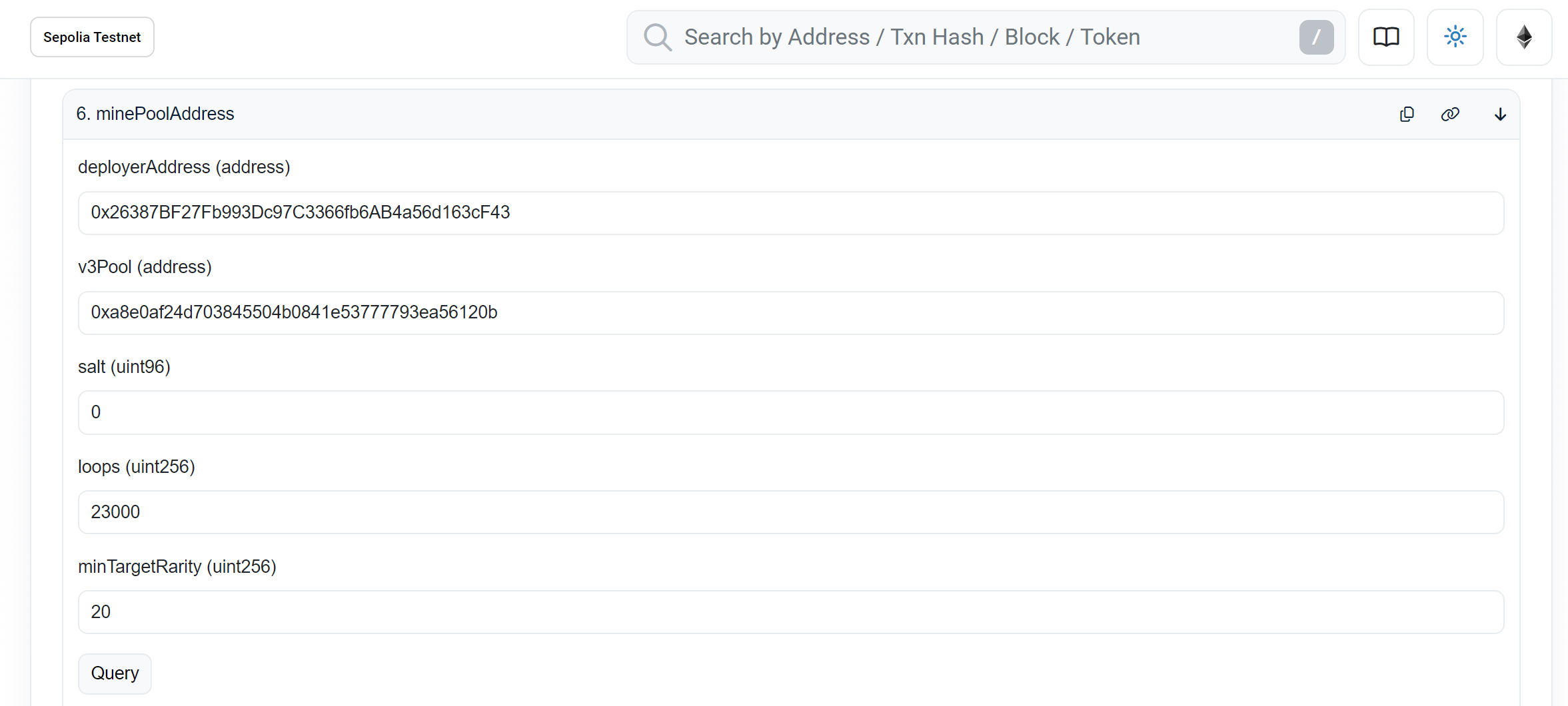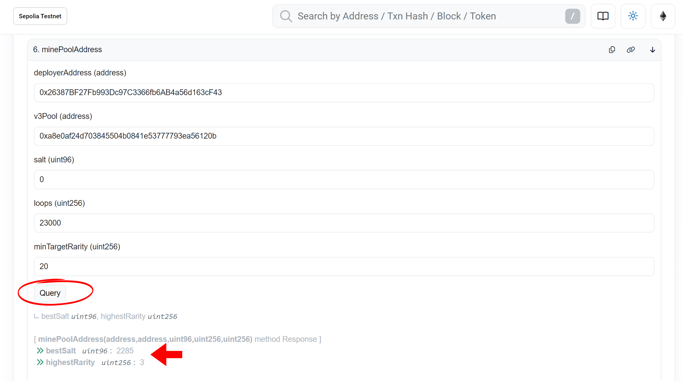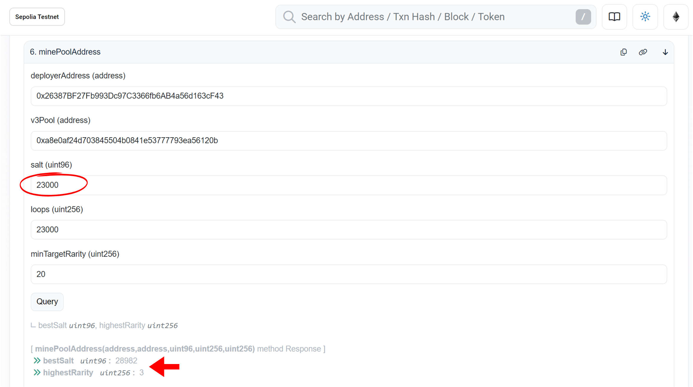 bestSalt: The optimal salt value for creating your pool.highestRarity: The rarity level of the NFT you will receive (based on the number of leading zeros in the mined pool address).