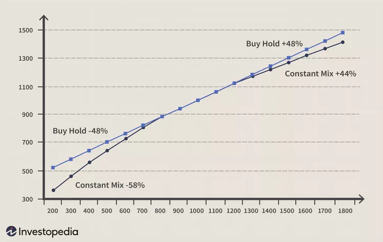 - Rebalancing: The P&L, excluding paid fees, of a constant-mix (fixed-weight) rebalancing portfolio which “buys low and sells high” to hedge. For example, if the price of ETH goes up, the rebalancing portfolio sells ETH at the higher market price. If the price of ETH goes down, the rebalancing portfolio buys ETH at the lower market price.