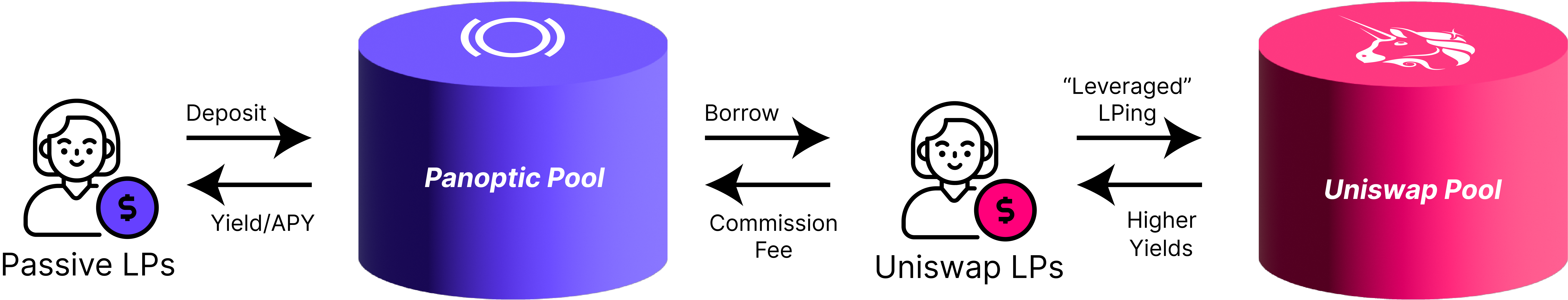 Panoptic introduces an innovative lending market specifically for Uniswap LPs, allowing them to create leveraged positions. For example, a Uniswap LP can borrow 5 ETH while only putting up 1 ETH as collateral, creating a 5x leveraged position in Uniswap v3. In return, the Uniswap LP pays a borrowing fee to passive LPs, who earn without needing to actively manage any positions.